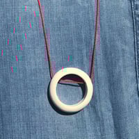 Product Description: Beautiful and simple porcelain necklace. One ring of natural white porcelain strung on a thin cord in a contrasting colour.